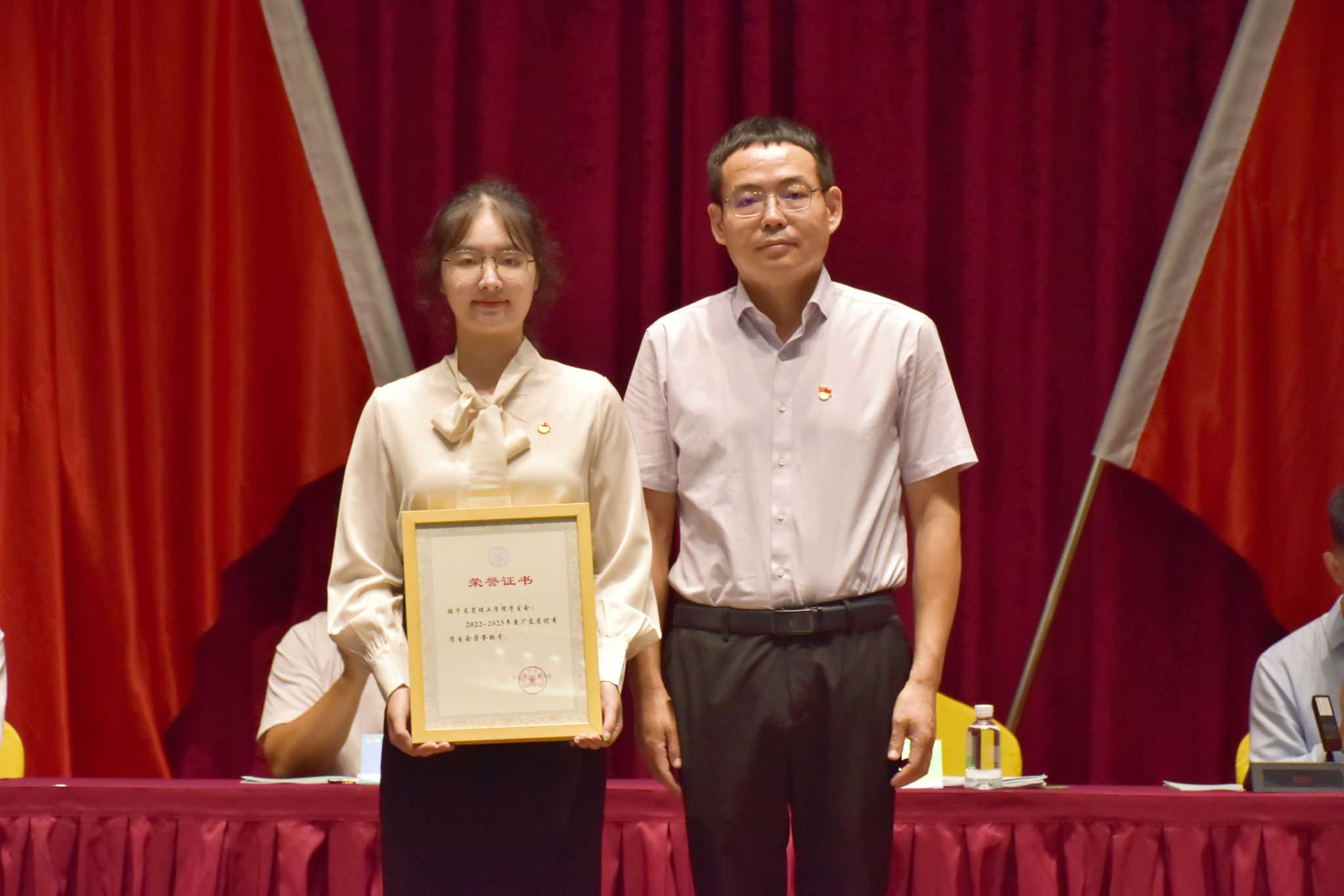 会议对获奖团体和个人进行了表彰,为“2022-2023学年广东省优秀学生会”获得单位东莞理工学院学生会,“2022-2023学年广东省优秀学生骨干”获得者佘哲祺、宋美莹同学颁奖。