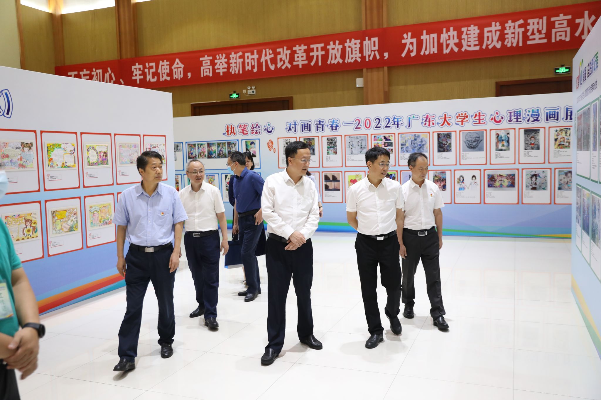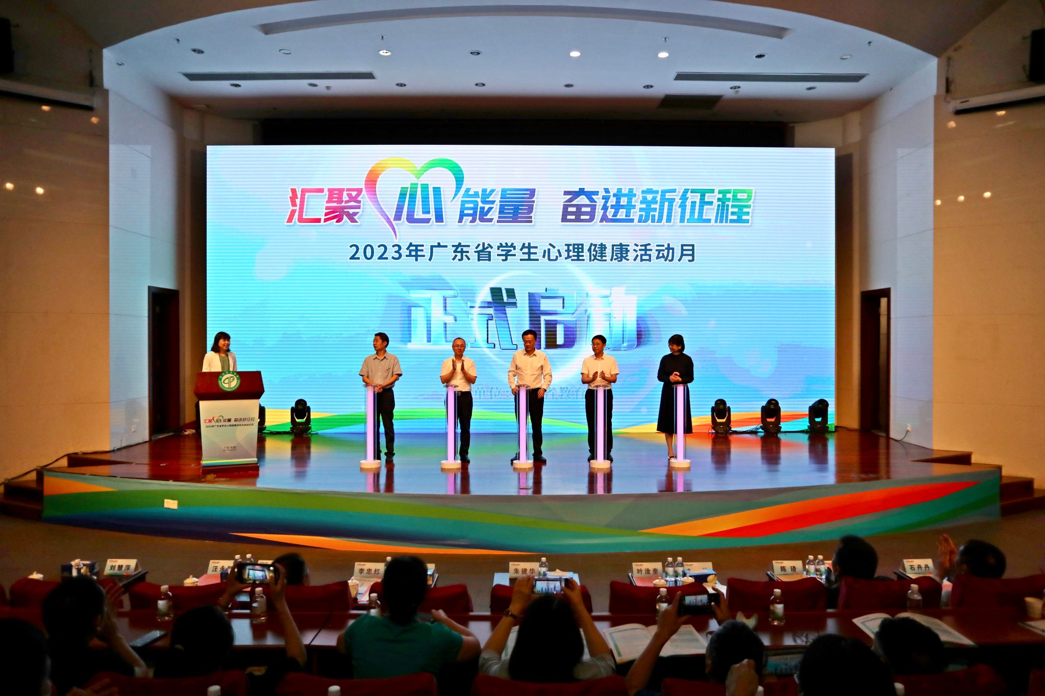 朱建华、成洪波、叶淦奎以及省中小学心理健康教育指导中心副主任刘冬梅、省中职学校心理健康教育与咨询专家指导委员会主任委员汪永智共同点亮灯柱,启动2023年广东省学生心理健康活动月。