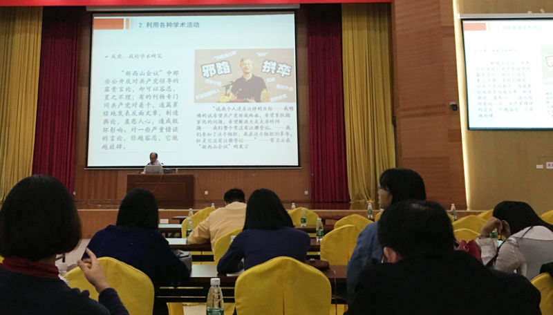 11月9日下午,学生工作进修班全体学员在会议中心多功能厅聆听了《意识形态建设与发展》的专题报告,主讲人为经管学院唐元松教授。唐教授从维护我国意识形态安全的意义,西方思潮对我国意识形态的挑战,西方势力对我国意识形态领域的渗透,加强意识形态安全工作的路径思考等四个方面,为学生工作队伍详细分析了意识形态工作面对的挑战,并提出了应对方案,认为学生工作者要真正沉下心来学习马列主义、毛泽东思想和中国特色社会主义理论,才能旗帜鲜明地坚决抵制西方的意识形态渗透和和平演变;要积极支持在意识形态领域弘扬正能量的亮剑