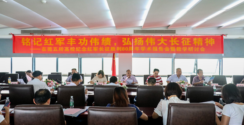 10月20日,为纪念红军长征胜利80周年,东莞市五所高校以“铭记红军丰功伟绩,弘扬伟大长征精神”为主题,举办学术报告会暨教学研讨会。我校党委副书记吕琦元、党委宣传部部长何献青,东莞市委宣传部理论教育科科长梁志斌以及东莞五所高校思政部部分骨干教师出席会议。会议由我校思政部主任吕有云主持。会上,吕琦元向各位同仁到莞工参会表示欢迎,介绍了我校建设高水平理工科大学的推进情况。他强调指出,高水平理工科大学的建设,需要长征精神的指引和鼓励,并建议东莞各高校在思政教育上展开合作,搭建教育平台,讲好长征精神,让