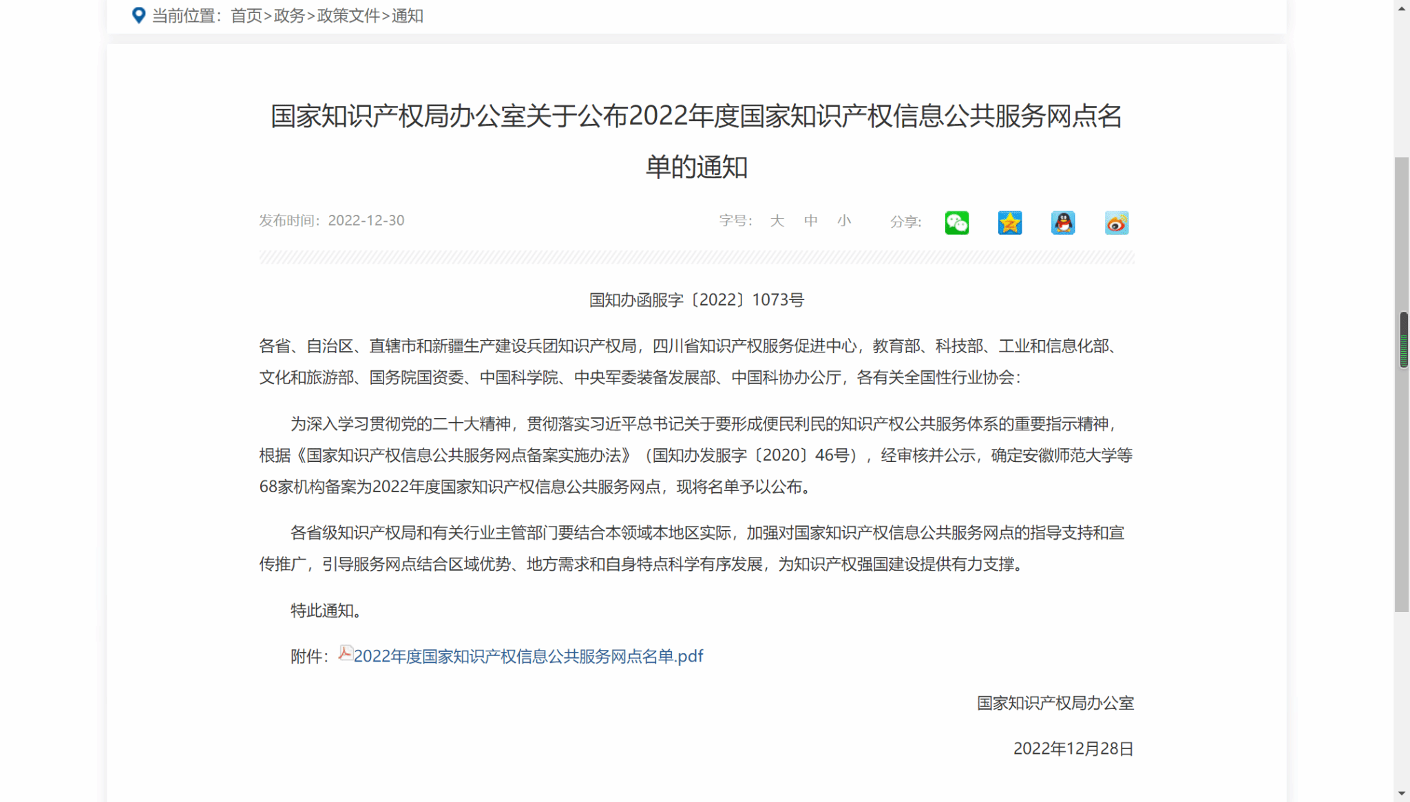 近日,国家知识产权局公布2022年度国家知识产权信息公共服务网点名单,我校成功入选。这是继2020年我校获批国家知识产权试点高校之后,我校再次获批的一个国家级知识产权平台,标志着我校知识产权工作又取得一个阶段性的突破。国家知识产权信息公共服务网点与TISC(技术与创新支持中心)、高校国家知识产权信息服务中心是目前国家最为重要的提供知识产权信息公共服务的社会化信息服务网点,是贯彻落实习近平总书记关于要形成便民利民的知识产权公共服务体系的重要指示精神,实施《知识产权强国建设纲要(2021—2035年