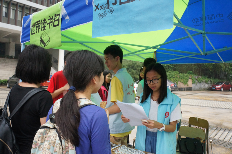 为倡导读书风气,在世界读书日到来之际,4月21日下午,师范学院组织学生分别在松山湖校区学生公寓广场和莞城校区图书馆门前举行了主题为“书香致远,芬芳人生”的读书会活动。本次活动主要以有奖问答形式举行,吸引了众多同学参与。师范学院的同学们在活动开始前就准备了很多涵盖文学历史、电影、宗教、音乐等多个方面不同难度的问题等待同学们来挑战。有奖问答以闯关的形式进行,共分为三个关卡,题目的难度会随着闯关者的进度增加,最终通关的同学还能获得一本精美的书。虽然当天天公不作美,下起了小雨,但也抵挡不住同学们参与活动