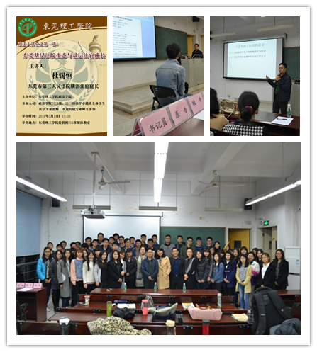 为让法学专业学生更加详细真实地了解基层法院的工作环境与基层法官的工作情况,3月24日,政法学院邀请东莞市第三人民法院横沥法庭庭长杜锡恒法官主讲“东莞基层法院生态与基层法官成长”专题讲座,学院2014级及2015级法学卓越班全体学生及部分教师参加了讲座。讲座伊始,杜锡恒向学生们分享了他从一个法学本科毕业生到一个法官的历程,以自身15年的法院工作经历向大家介绍法院里每一个职位的工作要求,真实地给大家展现了基层法官的成长路程,同时也向大家讲述了自身对于法治的梦想,让大家对于法院的认识有一个基本的架构。