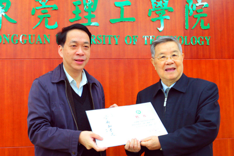 1月16日,我校敦聘中国科学院院士周炳琨院士为“双聘院士”。校长李琳教授向周炳琨院士颁发了聘书,并为其佩戴东莞理工学院校徽。校领导成洪波、武哲、吕琦元、安少华、邹晓平、戴炳源、李忠红、杨敏林和相关职能部门、院系负责人等参加聘任仪式。聘任仪式上,周炳琨院士表示,很高兴加入东莞理工学院高水平理工科大学建设的工作中,目前学校选择的智能制造发展方向很有前景,与东莞发展需求结合得很好,自己将尽己之力,为学校实现目标作出贡献,同时,将在各种场合推介学校,为学校引智工作穿针引线,努力让更多优秀人才加盟东莞理工