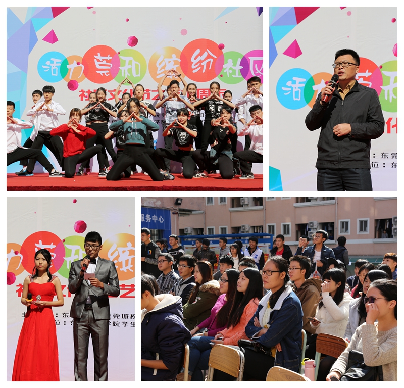 为了丰富社区文化和生活,打造和谐愉快的生活氛围,12月17日,莞和园社区举办了以“活力莞和、缤纷社区”为主题的社区文化节之艺术周末。莞城校区党总支书记陈伟、莞城校区管委会副主任赵涛以及学工队伍教师等出席了本次活动。在首届莞和园社区文化节上,校艺术团、吉他协会、歌手协会、轮滑协会等社团进行了精彩的表演,社区达人及学生自我服务小组干事也为社区观众表演了节目。艺术团带来名为《街头游戏》的舞蹈表演,十几位舞蹈人员身穿短袖或单衣在这寒冷的冬天里舞出动感,使现场气氛马上变得火热起来。六扇门乐队为观众带来两首