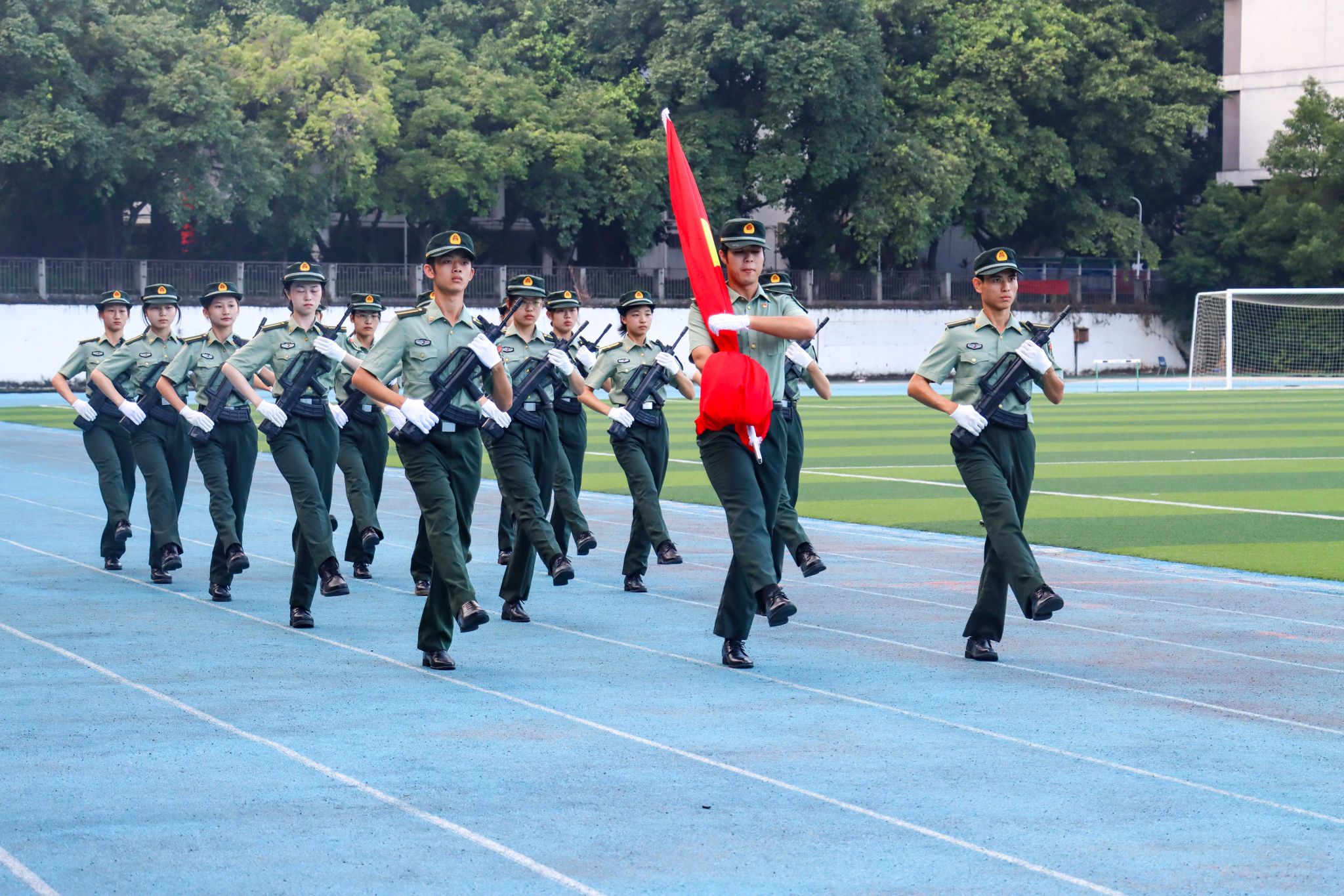 国庆节到来之际,我校在两校区同步举行升国旗仪式,700多名师生在10月的第1天见证五星红旗在校园里升起,同庆中华人民共和国成立73周年。国庆节前后,学校国旗护卫队还开展了“坚定理想信念,弘扬国旗文化”主题活动,邀请学生代表体验升旗流程,亲手为祖国升起国旗,在与国旗近距离接触中体会国旗的神圣与庄严,厚植爱国主义情怀。升国旗,莞工青年说爱国10月1日清晨,东莞理工学院在两校区举行升国旗仪式。“正步走!”随着一声令下,国旗护卫队踏着整齐划一的正步,护送着国旗,昂首阔步地走向升旗台。护旗方队步步铿锵,眼