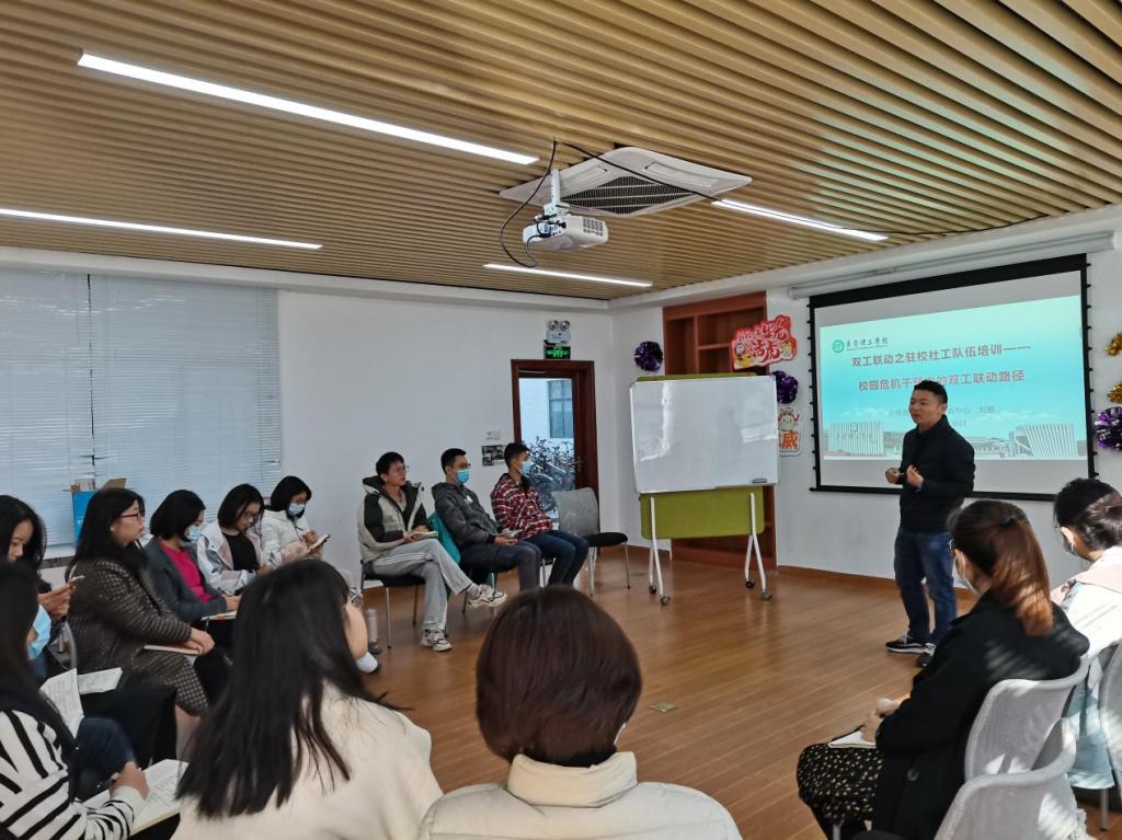 为进一步深化社区育人工作,切实提升驻校社会工作者队伍的专业知识和能力,促进社会工作与学生工作在更高水平上的协同、融合,12月30日,学工部、知行学院开展了双工联动工作坊之驻校社工队伍培训活动。本次工作坊主要围绕校园危机干预中的双工联动路径、叙事治疗在高校学生工作中的应用两个主要方面,分别由心理健康教育与咨询中心副主任刘勉和学生处社区育人项目主管滕爱聪进行分享和交流学习,两校区驻校社工参加培训。结合高校学生心理危机干预相关内容,刘勉从“导致危机的因素有哪些”问题出发引发大家思考和讨论,接着,采用危