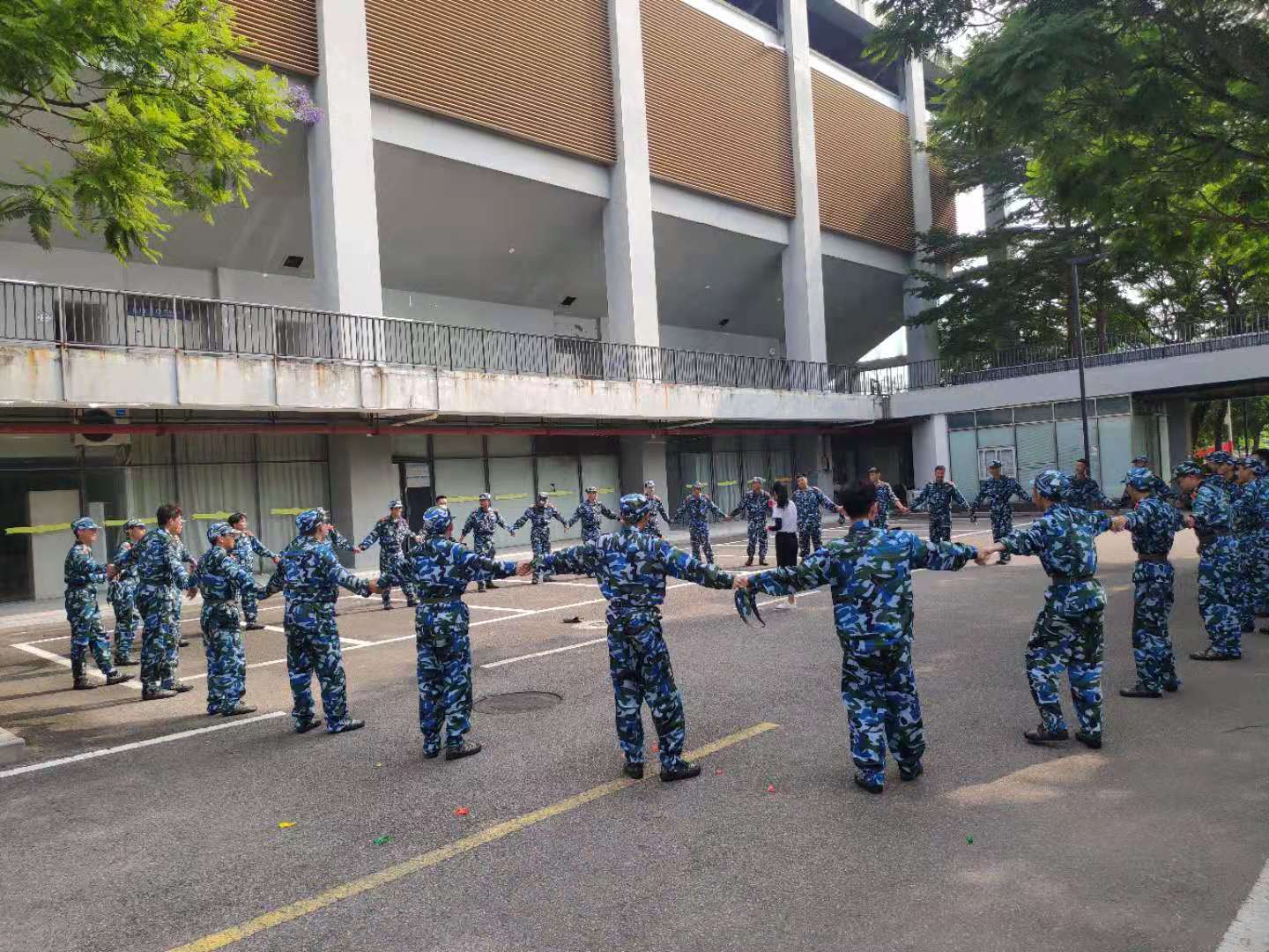 为深入落实“三全育人”综合改革举措,加强“双工联动”实效,在新生入学教育时期开展新生适应性工作,锤炼与养成相结合,引导新生转变、成长,9月16日至22日,学生社区知行学院驻校社工团队15名社工及78名学生志愿者,对2021级全体新生开展素质拓展训练。素质拓展训练贯穿在新生军训期间进行,围绕互动融入、创造力激发、团队协作等内容组织实施,通过营造压力与挑战的情景,帮助新生在团队协作中促进同学之间互相信任,激发学生潜能,获得个人价值感与集体荣誉感。松山湖校区举办了包括活跃气氛、提升专注度的热身活动,注