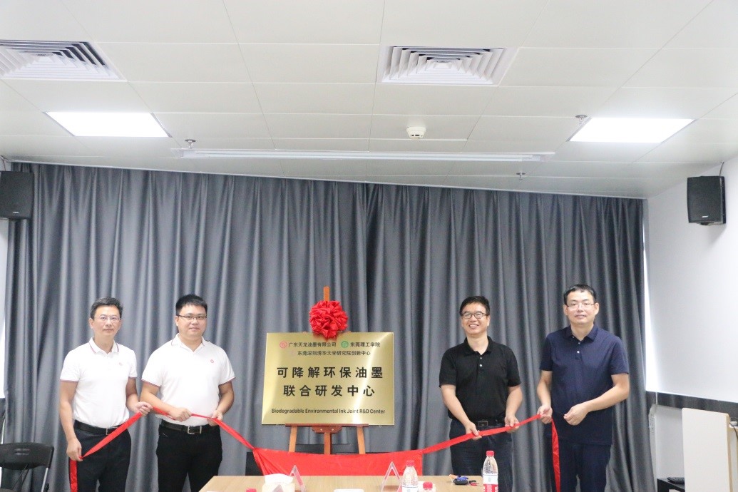 8月20日上午,由广东天龙油墨有限公司、东莞理工学院、清华东莞创新中心共同组建的“可降解环保油墨联合研发中心”揭牌仪式在东莞理工科技创新研究院举行。化能学院院长徐勇军,广东天龙油墨有限公司总经理蔡威、副总经理王纲,清华东莞创新中心副主任邬新国共同为可降解环保油墨联合研发中心揭牌。广东天龙油墨有限公司、东莞理工学院和清华东莞创新中心三方将发挥各自的特长与优势,强强联合,围绕印刷包装相关化学品进行多元化合作,构建集材料、工艺、技术服务等多领域为一体的联合研发中心,同时推动科研成果产业化。联合研发中心