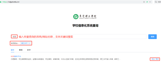 近日,学校信息化系统查询平台2.0正式上线。信息化系统查询平台整合集成100余个覆盖学校服务、管理与教学领域的信息系统和网站,提供网页端、微信端、i莞工APP端“三端”登录入口,旨在满足师生多渠道搜索需求,助力快速找到系统和网站入口。信息化系统查询平台入口及相应操作流程1、在网页端访问信息化系统查询平台(https://i.dgut.edu.cn/)。平台具有开放接口,支持关键词检索,同时提供常用网站添加及查看更多相关信息的服务。2、微信端前往【智慧莞工】公众号,依次点击下方菜单栏【资讯莞工】-