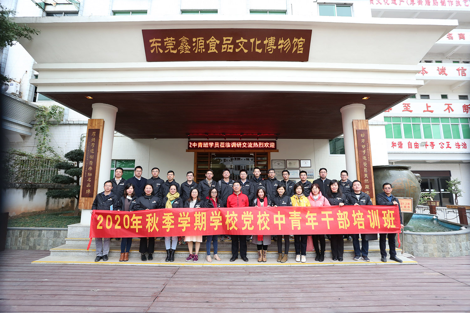 12月17日,2020年秋季学期学校党校中青年干部培训班学员奔赴厚街,先后走访了学校校友企业东莞市鑫源食品有限公司和鸿骏膳食管理有限公司,开展现场调研活动。在东莞市鑫源食品有限公司销售部副总经理刘小兵和讲解员的带领下,学员们参观了省级非遗项目传承保护基地——鑫源食品文化博物馆,了解了企业发展的历史和东莞厚街饮食文化发展历史。东莞市鑫源食品有限公司是我校1999届校友陈佩灵所创办,是一家综合型的食品加工和销售企业,主营的腊肠、腊肉、月饼等产品有浓厚的东莞特色,该公司目前有自营专卖店多家,代销客商达