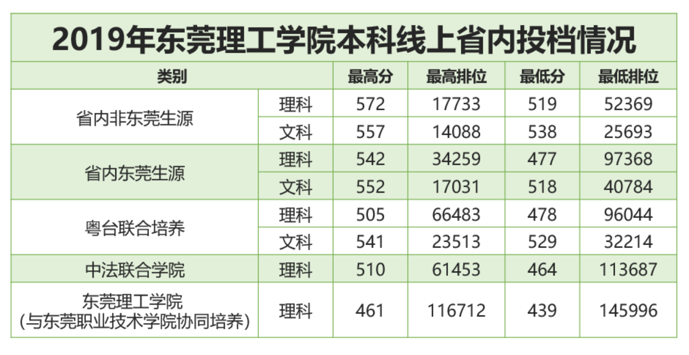 7月17日,广东省教育考试院对本科院校普通文理类本科线上考生进行投档,从投档情况看:我校理科最高出档分572分,最高排位17733名;文科专业大热;中法、粤台最低投档线大幅飙升。文科大热,实现新突破今年我校文科原计划招生988人,增加计划5人(非东莞生源增加3人,东莞生源增加2人),共计993人。近年来我校着力开展“新文科”建设,在文科建设的探索与实践方面取得显著成效,获得了社会的广泛认可。今年文科招生大热,省内非东莞生源文科最低投档线为538分,最低排位25693名,较2018年分数提高11分