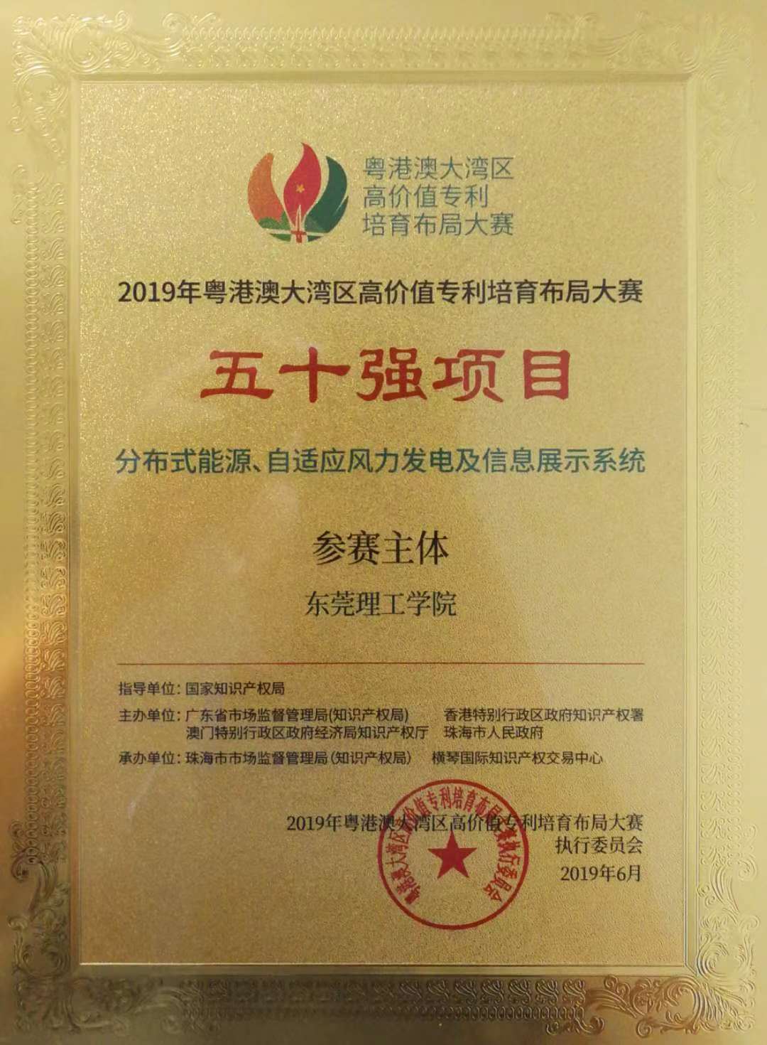 2019粤港澳大湾区高价值专利培育布局大赛(以下简称“湾高赛”)近日在广东省珠海市收官。我校陈佰满博士的项目“一种自适应型风力驱动户外全方位信息展示方法、设备及控制系统”获得了五十强奖项。湾高赛是在国家知识产权局指导下,由广东省市场监督管理局(知识产权局)、香港特别行政区政府知识产权署、澳门特别行政区政府经济局知识产权厅、珠海市人民政府主办,珠海市市场监督管理局(知识产权局)、华发集团旗下横琴国际知识产权交易中心承办。首届湾高赛旨在深化粤港澳大湾区知识产权合作,提升创新主体知识产权意识,培养创新