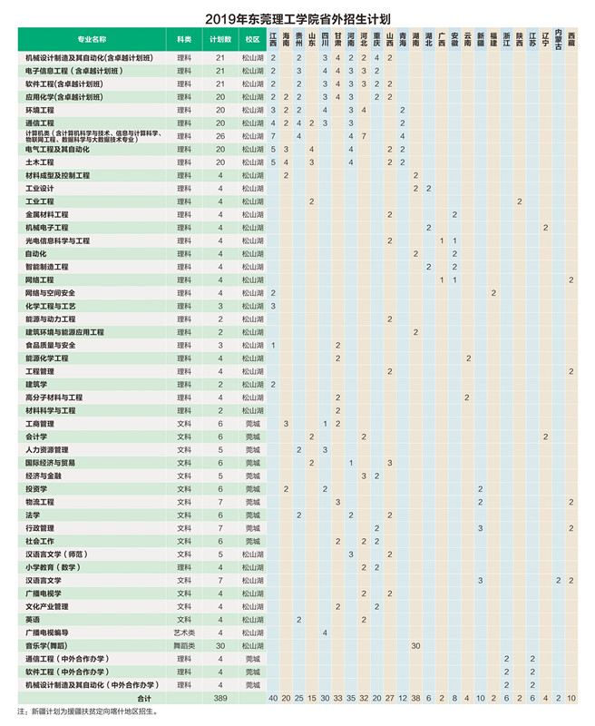 近年来,我校抢抓粤港澳大湾区和广深科技走廊重大历史机遇,以服务地方经济社会发展为使命,加快推进新型高水平理工科大学建设,办学综合实力不断增强,社会声誉进一步提升,生源质量也显著提高。2019年,我校省外招生计划共389人,较去年增加20%。我校首次在西藏进行招生,全部文理科专业在该区均为一本批次招生。今年在西藏投放10个招生计划,招生专业为网络工程、工程管理、物流工程、行政管理、汉语言文学共5个文理科专业。我校今年在江西省共投放40个招生计划。近三年(2016—2018年)我校在该省招生的理科专