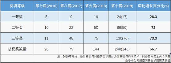 3月24日,由教育部就业指导中心指导,工业和信息化部人才交流中心联合举办的第十届蓝桥杯全国软件和信息技术专业人才大赛(广东赛区)比赛圆满结束。近日,从赛事组委会传来捷报:以原计算机与网络安全学院为主体的我校参赛学生表现出色,再创佳绩,一共斩获240个奖项。其中,一等奖24项、二等奖86项、三等奖130项。按照比赛章程,获得省赛一等奖的24名同学成功晋级,将参加5月下旬在北京举行的全国总决赛。与上届蓝桥杯省赛相比,在获奖比例不变的前提下,我校学子在本届竞赛的获奖质量再创历史新高。其中,一等奖获奖人