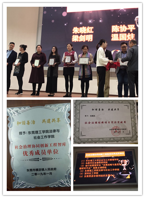 1月9日,横沥镇“和谐善治共建共享”社会治理协同创新工作推进会在横沥镇政府大会堂举行。会议表彰了2018年度参与社会治理的先进集体和个人。法社学院被授予社会治理协同创新工程智库优秀成员单位,法社学院副院长朱晓红副教授被授予社会治理创新项目突出贡献奖。2018年,横沥镇党委、镇政府坚持问题导向和需求导向,从人民群众对公平、正义、和谐、安全等的需求出发,深入实施社会治理协同创新工程,营造共建共治共享社会治理新格局,有力促进了横沥的平安、和谐、稳定。为更好地总结2018年工作经验,展望未来,带动更多的