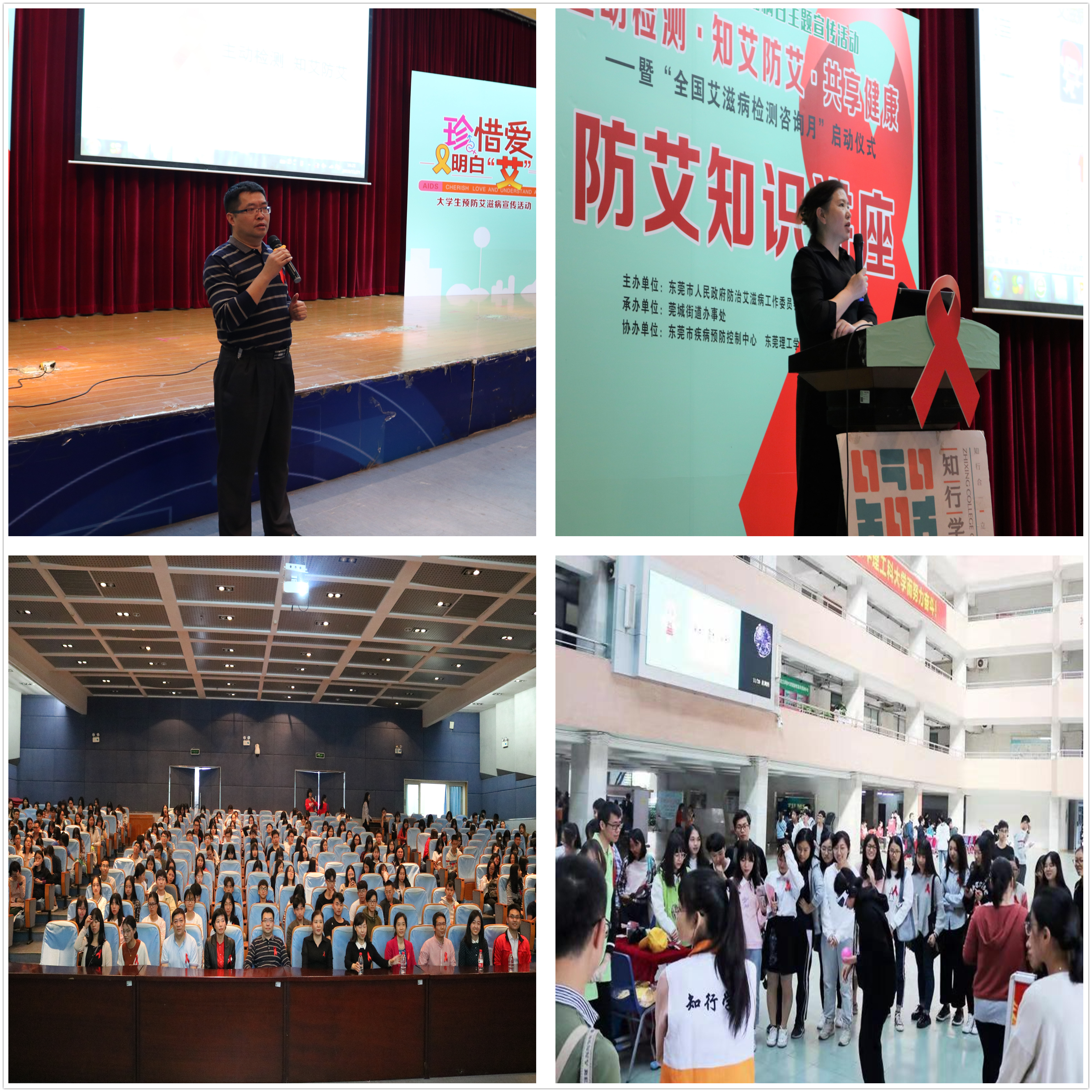 11月29日,我校知行学院携手东莞市人民政府防治艾滋病工作委员会、莞城街道办事处、东莞市预防疾病控制中心等单位于莞城校区举办艾滋病防治宣传活动。莞城校区管委会常务副主任刘健、东莞市卫生计生局副局长尹露萍、东莞市莞城街道党委委员叶小敏等出席活动。此次活动吸引了近700名师生参与。本次活动主要通过游园会和讲座的形式,向同学们宣传艾滋病防治工作。同学们通过阅读艾滋病知识卡片、参与游园活动,了解艾滋病的防治工作。讲座上,东莞市疾控中心艾滋病防治所所长朱建琼为同学们讲解了艾滋病知识,传授处理艾滋病问题的方