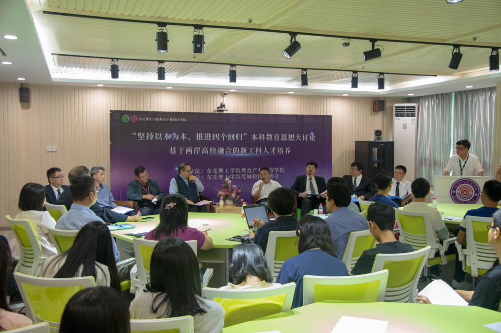 为全面贯彻落实习近平总书记在2018年全国教育大会上重要讲话精神,陈宝生部长在新时代全国高等学校本科教育工作会议提出的“坚持以本为本,推进四个回归”,加快建设高水平本科教育、全面提高人才培养能力的要求,在学校的统一部署下,10月15日,粤台产业科技学院开展“坚持以本为本、推进四个回归”本科教育思想大讨论——基于两岸高校融合的新工科人才培养。我校副校长马宏伟教授、台北科技大学管理学院院长邱垂昱教授、迅得机械(东莞)有限公司总经理罗锦堃,学校有关职能部门负责人,粤台学院各系主任、教师和学生代表参加了
