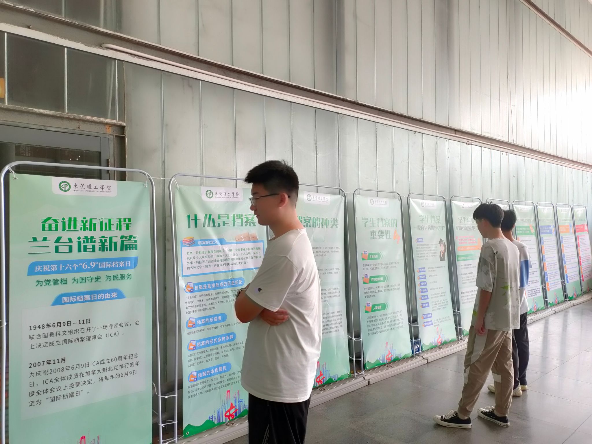 为庆祝第16个国际档案日,深入学习宣传贯彻党的二十大精神,贯彻落实习近平总书记关于做好新时代档案工作重要指示批示精神,履行“为党管档,为国守史,为民服务”的宗旨,党政办公室档案室以普及档案知识,提高档案意识,弘扬档案文化为重点,在图书馆一楼报告厅门前设置了围绕“奋进新征程兰台谱新篇”为主题的档案知识专题展览,对《中华人民共和国档案法》、档案基础知识和档案文化等多方面知识进行宣传,学校电子屏同步滚动播放国际档案日宣传海报,引导大家深入了解档案工作现状,强化学习档案知识、支持档案工作的意识。现场设立