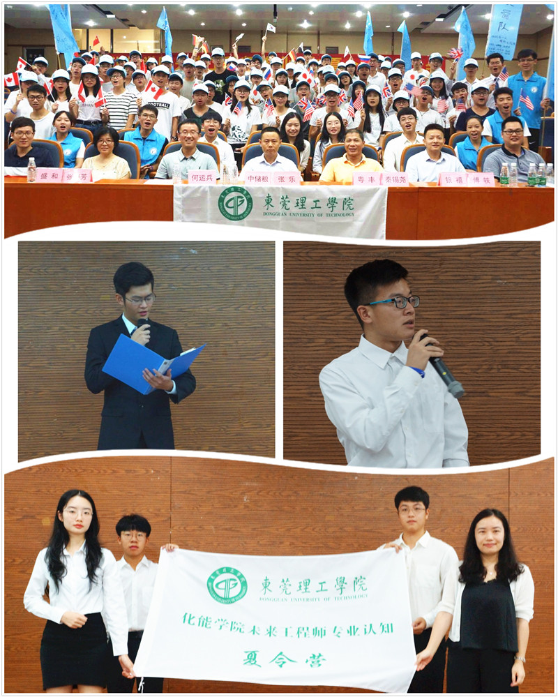 7月15日,在松山湖校区学术交流中心报告厅,一群举着不同国家旗帜的青年,身着正装,欢聚一堂,分别依次用中英文介绍美、英、俄、德、日、韩、加、中八个国家关于本国绿色化学可持续发展的报告,八个国家的“代表”,相互提问,谈论“各国经验”,气氛时而严肃,时而热烈……原来,这是化学工程与能源技术学院“未来工程师”专业认知夏令营正在举行以“绿色化学:可持续发展”为主题的模拟八国峰会。创新形式开展专业认知实践在活动前,报告厅首先举行了简单而热烈的开营仪式暨动员大会,来自化能学院2017级的94名学生,喊出了“