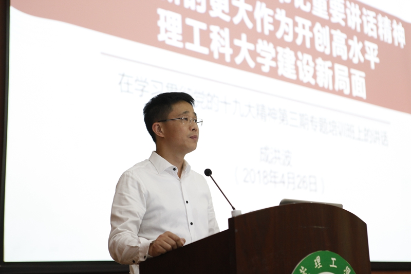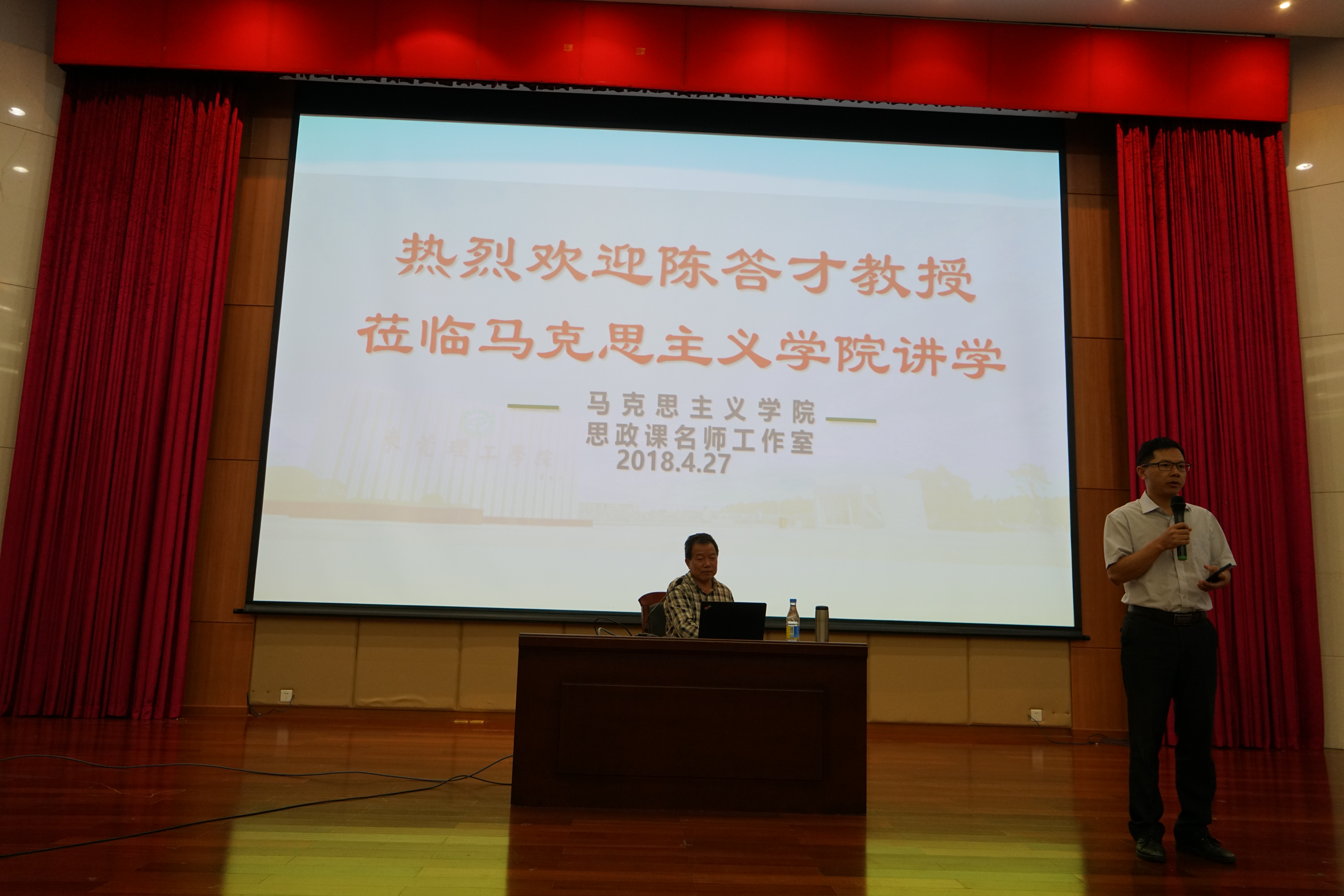 4月27日,陕西师范大学马克思主义学院《纲要》教研室一行来我校交流,双方就《纲要》课改革与建设进行了沟通交流。晚上,陕西师范大学的陈答才教授为我校师生做了“党的十九大的历史方位”的学术报告。报告会由马克思主义学院银锋副院长主持,郭奕鹏等老师以及四百多名学生参加了活动。陈答才教授从“政治宣言、愿景细描、行动纲领”三方面阐释党的十九大的历史方位。陈教授党史功底深厚,对党的知识如数家珍,信手拈来。他从历届党代会的历史地位和历史意义出发,引出党的十九大的历史方位问题。陈教授对党的十九大的历史方位的分析,