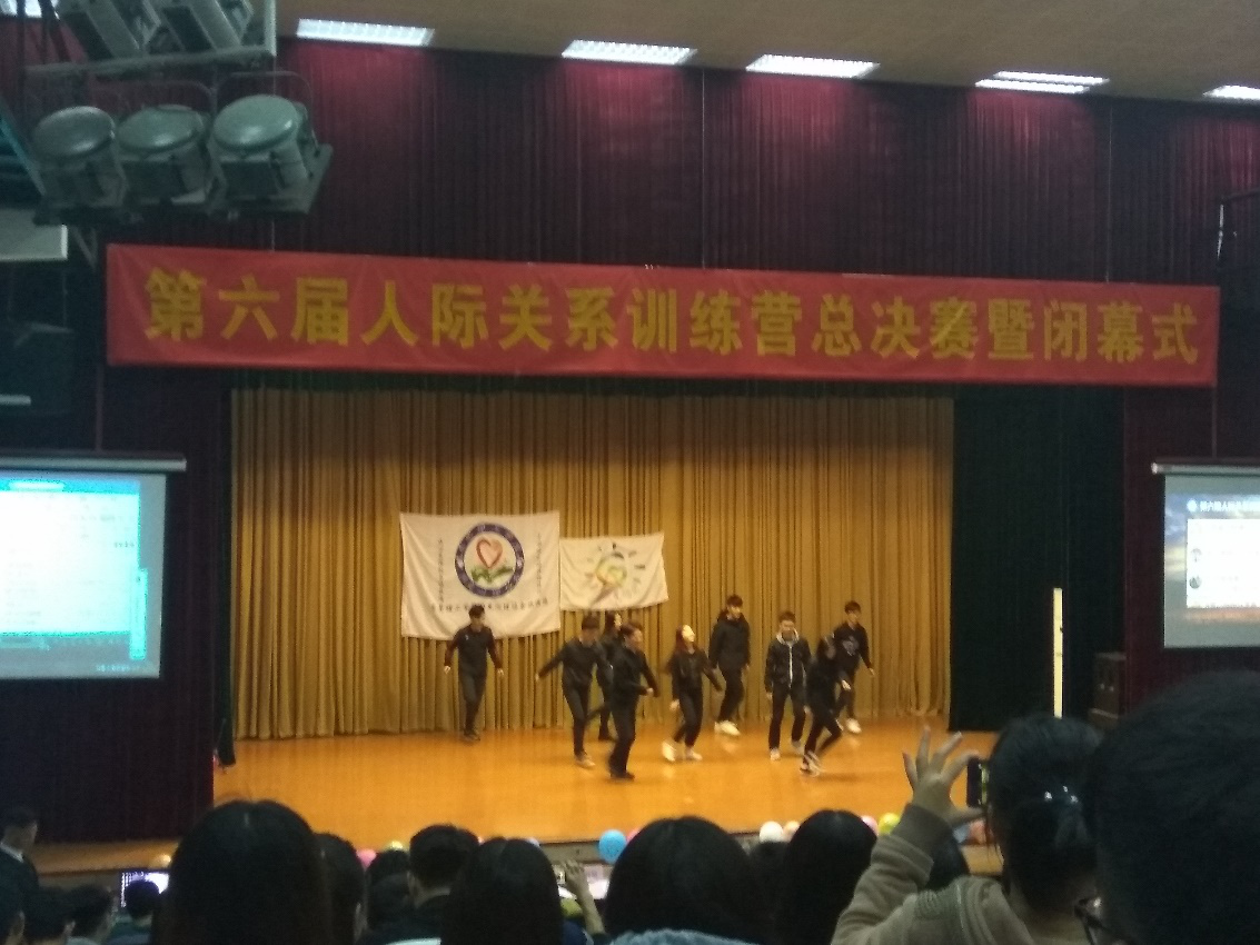 12月16日晚,由学生社区知行学院主办,阳光心理协会承办的第六届人际关系训练营总决赛在我校学生活动中心小剧场闭幕。在闭幕式上,各营回顾了成员之间从相识到相知再到相爱的历程,参与学员深刻感受到了自身的积极成长,人际关系训练营帮助他们践行感悟和谐人际的真谛,从期待交到更多朋友的此岸,到悦纳自我、开放自我以及接纳他人的彼岸。据悉,本届人际关系训练营以社区为单位分为十五个营。训练营内容丰富,包括“相识一团体辅导”“相知一舞动交流识成长”“协助一社区团队任务挑战赛”和“升华一社区团队展示”四个模块,持续一