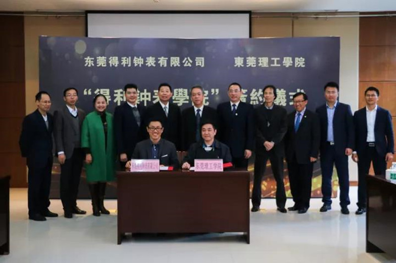 12月12日,我校与东莞得利钟表有限公司联合组建“得利钟表学院”并举行签约仪式。我校校长李琳、副校长杨敏林,东莞得利钟表集团董事长梁伟浩、总经理刘仁出席仪式。签约仪式由我校发展与联络办主任崔学海主持。双方代表共同签署了关于组建“得利钟表学院”的合约,李琳代表我校向得利钟表集团颁发了荣誉证书。双方表示,合作以后,将会遵循共赢的原则,共同为钟表事业培养更多人才。梁伟浩与杨敏林分别代表双方讲话,共同阐述了人才培养对中国制造的重要作用。梁伟浩高度认同东莞理工学院在高水平理工科建设过程中坚持以学科专业建设