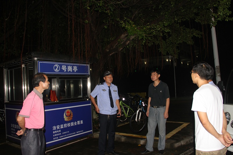 10月1日晚,国庆佳节之际,保卫处处长张力带队巡查校园,慰问在岗执勤的校卫队员。巡查中,张力要求大家一定要提高警惕,加强巡逻检查,确保广大师生员工度过一个欢乐祥和的佳节,迎接党的十九大的胜利召开。在校卫队队部,张力与校卫队员一起座谈聊天。