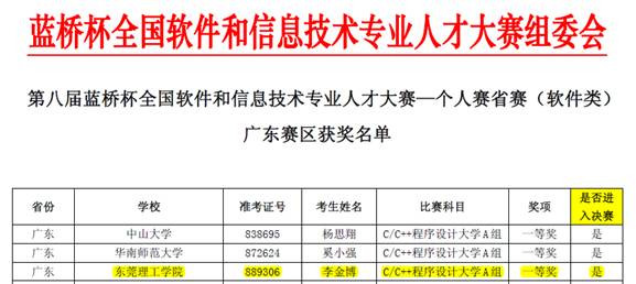 4月8日,由我校计算机与网络安全学院承办的第八届全国软件与信息技术专业人才大赛(简称“蓝桥杯大赛”)省赛(广东赛区)在我校顺利结束。近日,从组委会传来喜讯:此次参赛的计算机与网络安全学院学子们表现优异,一共获得79项奖项,其中一等奖9项(同时获得参加国家级决赛的资格),二等奖22项,三等奖48项。特别值得欣喜的是,学院2016级学生李金博、2014级学生黄益辉勇于挑战,分别参加了主要面向中山大学、华南师范大学等985/211高校学生的C/C++程序设计、JAVA软件开发大学A组比赛,并双双获得全
